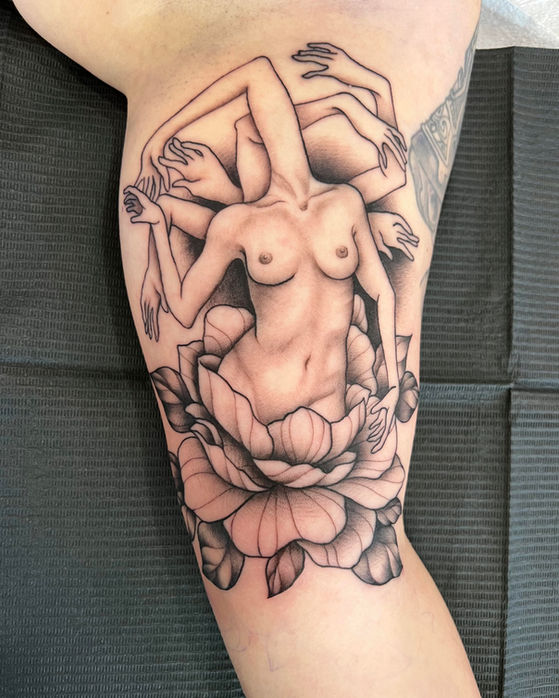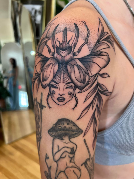 Mia has always had a natural affinity for art. She apprenticed under Feliz, and has since flourished into a skilled tattoo artist. She has been professionally tattooing for over 3 years. While Mia loves creating Neo-Traditional style tattoos with color and dark themes, she enjoys continually adding different styles and techniques to her repitiore.